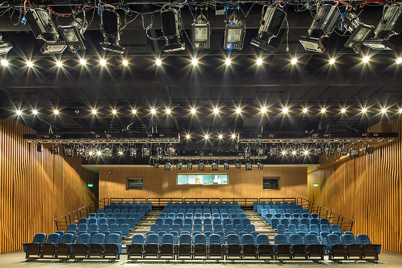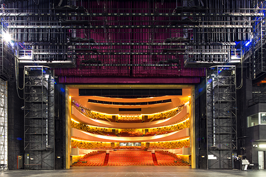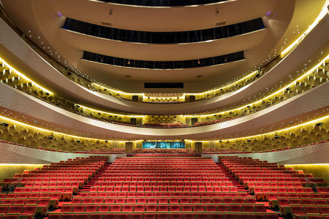大劇場(chǎng)金色大廳內(nèi)“鞋盒式”布局的觀眾席可容納1501人。劇場(chǎng)內(nèi)部的設(shè)計(jì)、用材,充分考慮建筑聲學(xué),混響時(shí)間達(dá)到國際標(biāo)準(zhǔn)的1.6秒。主舞臺(tái)采用國際上通行的“品”字形舞臺(tái),舞臺(tái)機(jī)械、燈光、音響系統(tǒng)等設(shè)備均按照國內(nèi)一流標(biāo)準(zhǔn)配置。能夠承接國內(nèi)高水平的大型歌劇、舞劇、大型綜藝晚會(huì)的演出并兼顧交響樂、室內(nèi)樂、合唱等演出和會(huì)議的需要,具備承接國際演出團(tuán)體演出的基本功能和條件。